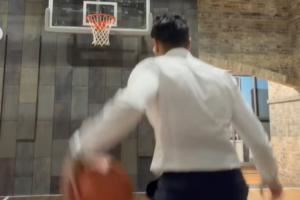 球技不错!Shams晒自己连续工作14小时后西装革履运球&投篮视频
