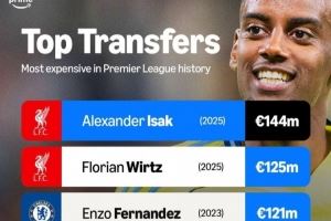 英超历史转会费榜:利物浦今夏连签伊萨克、维尔茨,两度刷新纪录