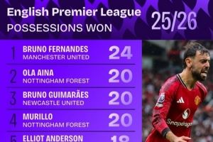 新赛季英超赢得球权榜:B费24次居首 布鲁诺&帕奎塔&格拉利什在列
