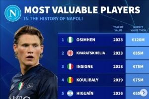 那不勒斯队史球员身价排行:奥斯梅恩1.2亿欧第一,K77第二